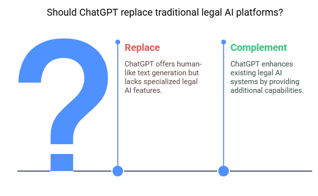 ChatGPT, though an exceptional tool, is not a substitute for specialized, purpose-built legal AI platforms. Instead, it complements these systems, enhancing their capabilities while addressing specific needs in the legal field.