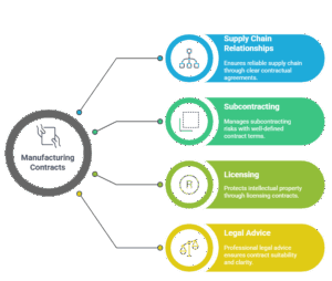 Manufacturing contracts are essential for ensuring smooth operations, managing risks, and protecting intellectual property. With so many different contract types available, it’s crucial to understand which one is best suited for your business needs. Whether you’re dealing with supply chain relationships, subcontracting, or licensing, having well-drafted agreements is key to protecting your interests and ensuring successful outcomes.